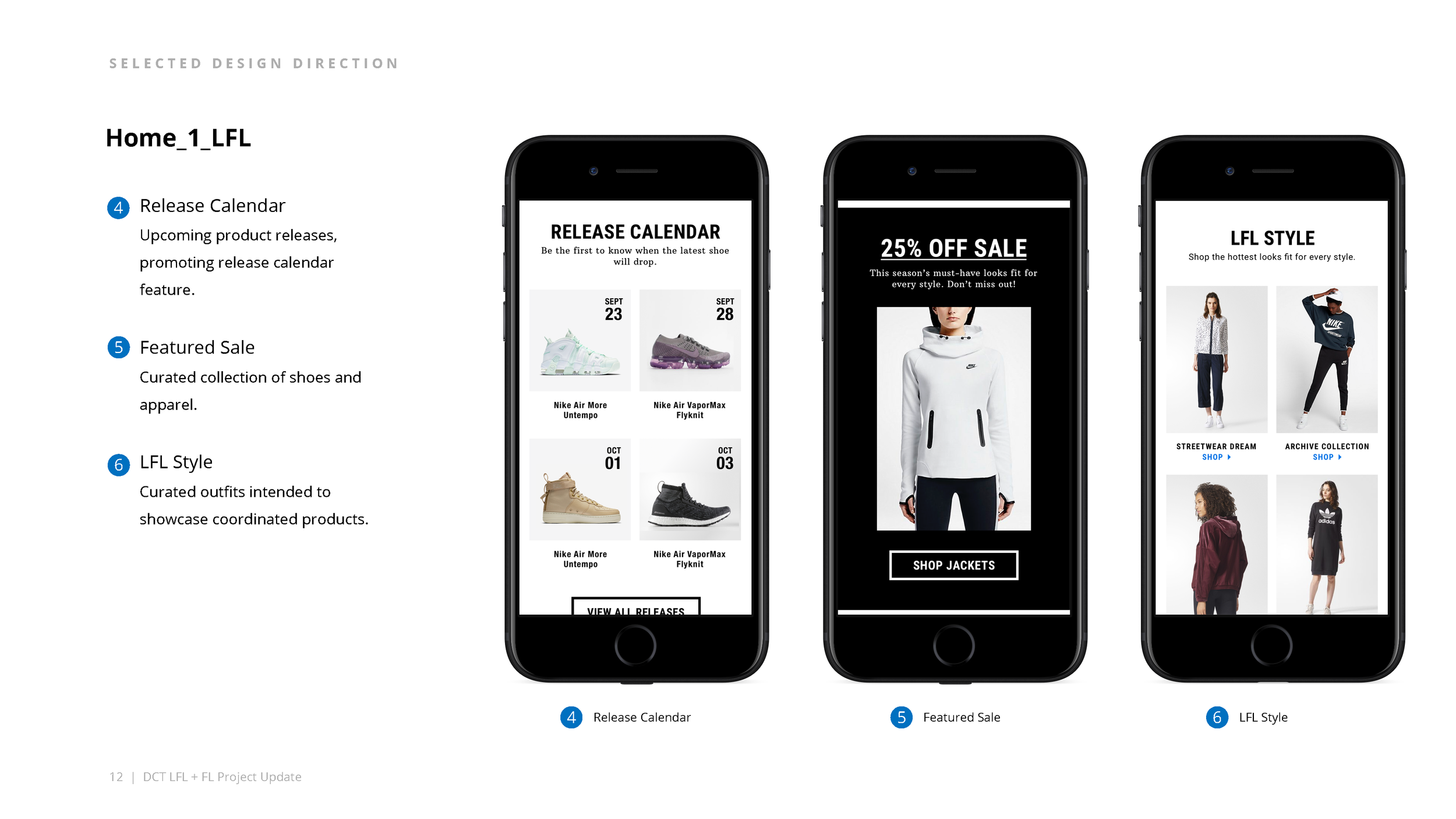 I was the lead designer on the Foot Locker and Lady Foot Locker account. I oversaw our design team offshore in Mumbai and brought on a visual designer in our New York studio to help with design efforts. I implemented a design plan for my team and delegated tasks to the other designers. I lead stand up with the design team every morning to capture the work being done on/off shore. I delivered the design plan and daily goals to the client. I fostered a client relationship, working onsite with their in house design team and presented to client leadership and our project leadership, including the partner and senior manager. I lead a design workshop with the client to align on project goals and their vision. I provided visibility across the team, documenting conversations, notes, and daily tasks in google docs to ensure everyone was aware of the current events.