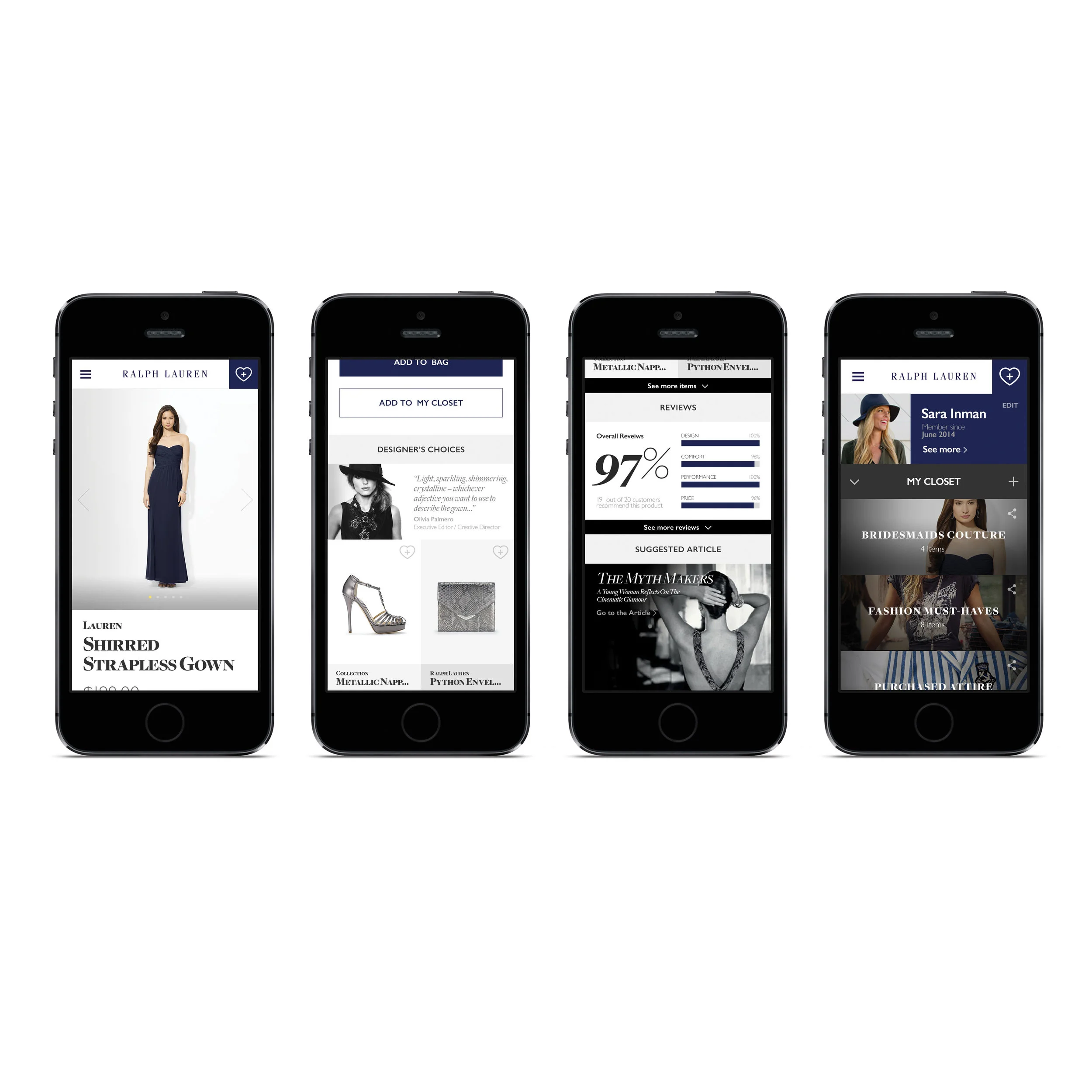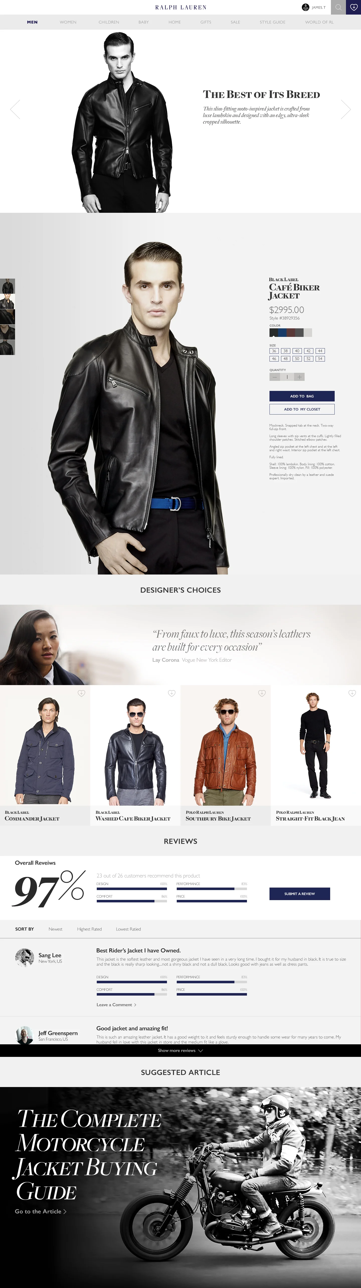 Sara's story revolves around the concept of creating a wish list. As a result, we designed the component "my closet" to allow user's to curate their own wardrobe, save for later, share with friends and family, and allow Ralph Lauren to suggest similar items. Sara's story revealed the need for accessing the site on a mobile device, or on the go. At the time, Ralph Lauren's website was not responsive. Some of the other PDP requirements that were discovered in the story included, product suggestions / product pairings, product reviews, save for later functionality, user profile, and share.